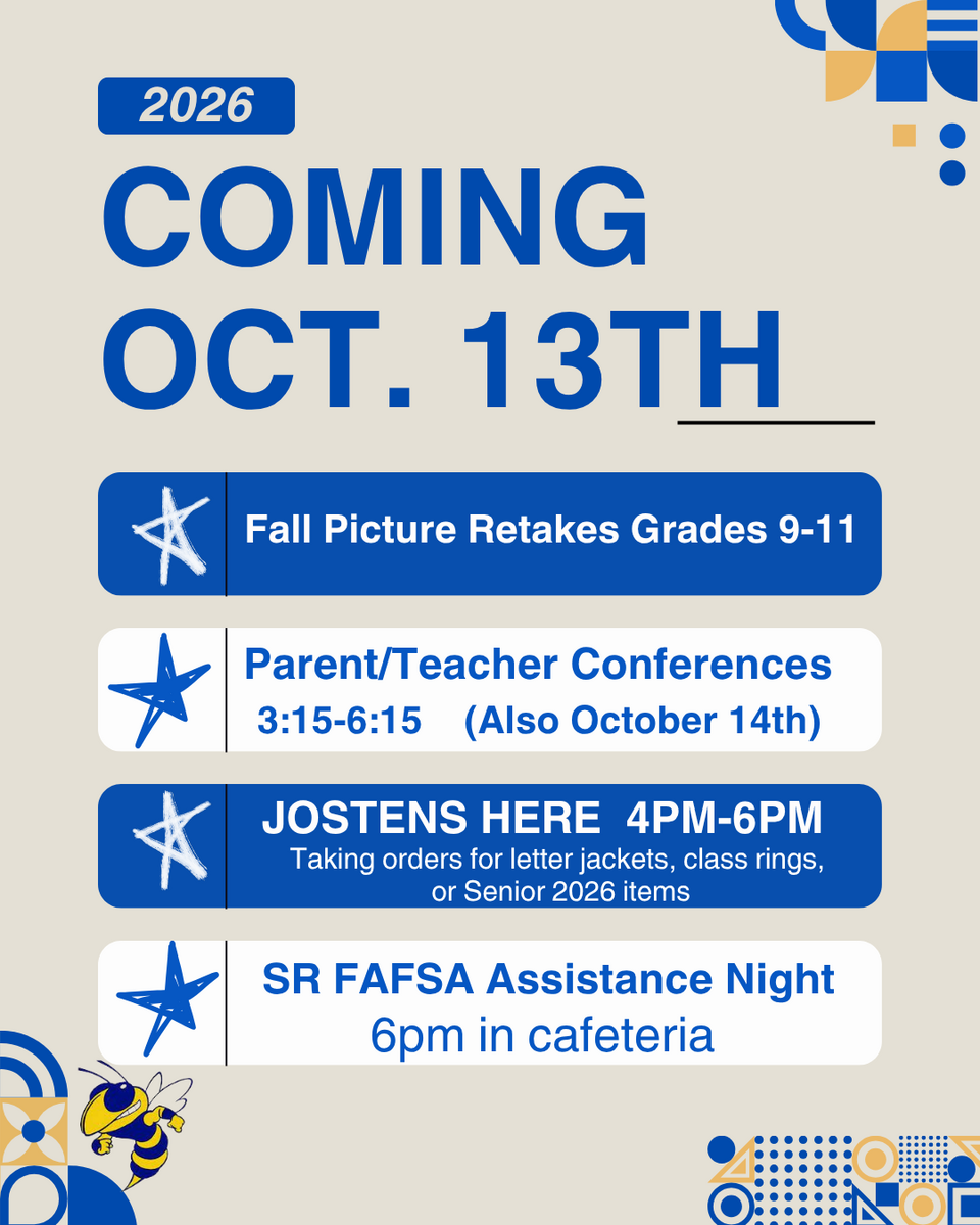 We have a busy 10 days coming up! Friday the 10th ** Football is home with Heritage Hall at 7pm Monday the 13th ** see below, plus JV Football Home Tuesday the 14th ** Parent/Teacher conferences . . .
