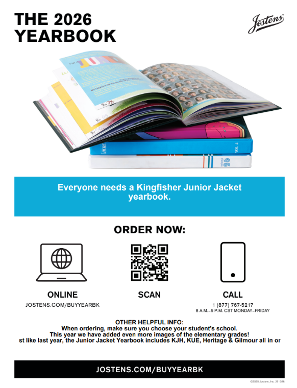The 2025-26 Kingfisher Junior Jacket yearbook is on sale! Order now and save $5. Prices will increase to $40 soon. Go to jostens.com and pay $35 until Feb. 27. The Junior Jacket Yearbook includes g...